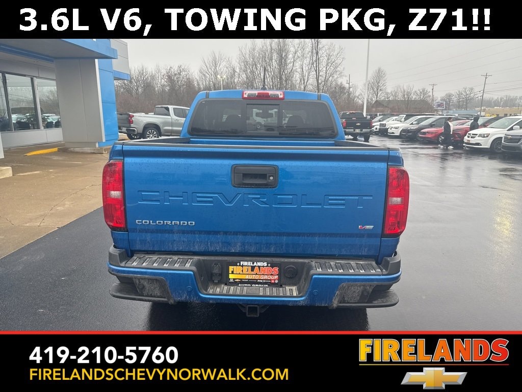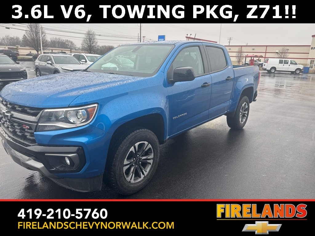 2022 Chevrolet Colorado Z71Car Bravo Certified, Great Price, Clean CarFax, Like New, Steering Wheel Controls, Cruise Control, Keyless Entry, Satellite Radio, Premium / Alloy Wheels, Tow Package, Trailer Package, Trailer Hitch, Colorado Z71, 4D Crew Cab, V6, 8-Speed Automatic, RWD, Bright Blue Metallic, Black Cloth, Heavy-Duty Trailering Package, Hitch Guidance, Preferred Equipment Group 2Z7, Tow/Haul Mode, Ultrasonic Rear Park Assist.Clean CARFAX. CARFAX One-Owner.RWD V6 8-Speed AutomaticOdometer is 18403 miles below market average!Welcome to the Firelands Family!! We understand that you donât want to come to a dealership and play games for hours. Thatâs why we focus on a few key principles: Be Really Fast Be Really Friendly, Be Really Fun, Be Really Honest. The price you see is the price you pay; plain and simple! We price our cars NOT our customers and hope that you have fun when you are here. We will never advertise misleading or confusing payments thatâs not our style. Rather, we hope to give you the best retail experience possible; after all: we LIVE off repeat and referral business. Our Vehicle Specialists are NOT paid on the profit (or loss) of a vehicle. You have DIRECT access to our Sales and Finance Managers cell phone numbers. We canât wait to put our best foot forward and have you leave smiling for years to come!