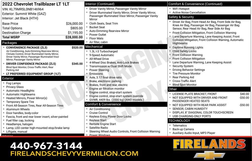 With its spacious interior, advanced technology, and impressive performance, this 2022 Chevrolet TrailBlazer LT is the perfect choice for those seeking a versatile and well-equipped crossover. Experience the difference for yourself by scheduling a test drive today. We're confident you'll be impressed by the quality and value this vehicle has to offer.