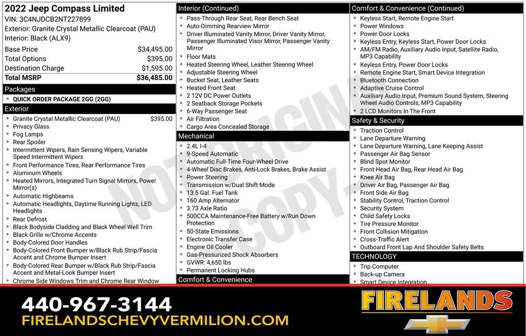 Discover the perfect blend of style, capability, and comfort in this 2022 Jeep Compass Limited. With its sleek Granite Crystal Metallic Clearcoat exterior and well-appointed interior, this SUV is ready to elevate your driving experience.- One Owner- Accident Free CarFax- Well Serviced- AWD / 4WD- Heated Seats- Leather Seats- Cruise Control- Steering Wheel Controls- Bluetooth Audio- Alloy Wheels- Back Up Camera- 4x4- Heated Leather SeatsPowered by a 2.4L I4 engine paired with a 9-Speed 948TE Automatic transmission, this Compass Limited delivers an impressive balance of performance and efficiency, with an EPA-estimated 22 city/30 highway MPG.Step inside and you'll be greeted by a wealth of premium features, including the Uconnect 5 infotainment system with a stunning 10.1 touchscreen display, a heated steering wheel, and heated front seats. The Compass also boasts a host of advanced safety technologies, such as the ParkView Rear Back-Up Camera and SiriusXM Guardian emergency communication system, providing you with added peace of mind on the road.Designed to handle both the daily commute and weekend adventures, the Jeep Compass Limited offers the versatility you need. Its spacious interior and flexible cargo area make it the perfect companion for your active lifestyle. And with the available 4WD system, you can conquer any terrain with confidence.This exceptional Compass Limited is a true standout in its class, blending rugged capability, premium amenities, and a refined driving experience. Don't miss your opportunity to make this SUV your own. Schedule a test drive today and discover the difference that the 2022 Jeep Compass Limited can make in your life.