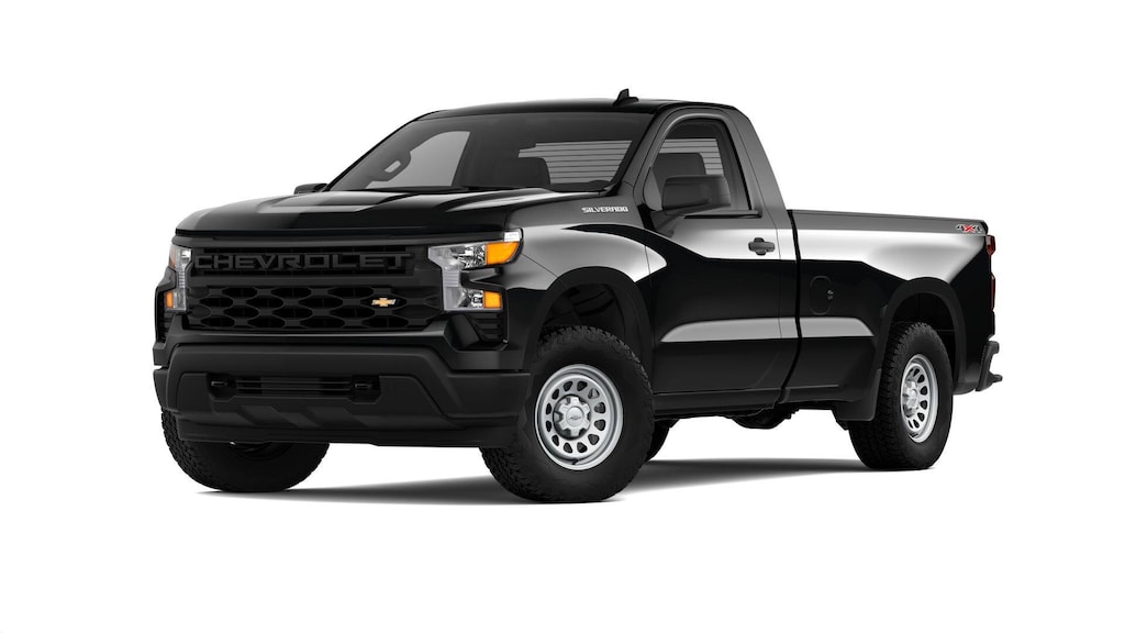 2025 Black Chevrolet Silverado 1500 WT 4WD 8-Speed Automatic EcoTec3 5.3L V8 8-Speed Automatic, 4WD, Jet Black Vinyl, 3.5 Monochromatic Display Driver Info Center, 4-Way Manual Driver Seat Adjuster, Black (Semi-Gloss) Front Bumper, Black (Semi-Gloss) Rear Bumper, Bluetooth® For Phone, Electronic Cruise Control, Front Frame-Mounted Black Recovery Hooks, HD Rear Vision Camera, Heated Power-Adjustable Outside Mirrors, Inside Rear-View Mirror w/Tilt, Locking Tailgate, Manual Tailgate Function w/No EZ Lift, Manual Tilt Wheel Steering Column, OnStar Services Capable, Power Front Windows w/Driver Express Up/Down, Power Front Windows w/Passenger Express Down, Preferred Equipment Group 1WT, Remote Keyless Entry, Rubberized-Vinyl Floor Covering, SiriusXM Delete, Solar Absorbing Tinted Glass, Standard Suspension Package, Standard Tailgate, Teen Driver, Tire Pressure Monitoring System, Wi-Fi Hot Spot Capable.