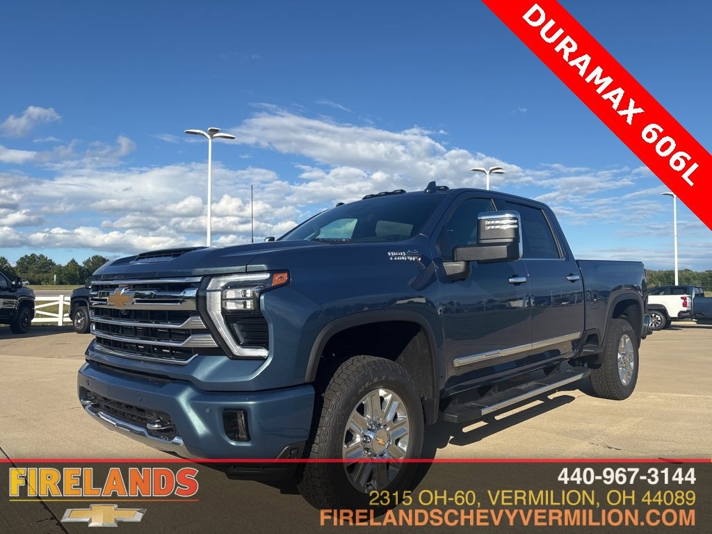 2025 Lakeshore Blue Metallic Chevrolet Silverado 3500HD High Country 4WD 10-Speed Automatic Duramax 6.6L V8 Turbodiesel 10-Speed Automatic, 4WD, Blue Leather, 120-Volt Bed Mounted Power Outlet, 120-Volt Interior Power Outlet, 170 Amp Alternator, 6 Rectangular Chromed Tubular Assist Steps, Auto-Dimming Inside Rear-View Mirror, Auto-Dimming Inside Rearview Mirror w/Camera, Bed View Camera w/2 Trailer Camera Provisions, Bluetooth® For Phone, Chevrolet Connected Access Capable, Chevytec Spray-On Black Bedliner, Chrome Door Handles, Chrome Mirror Caps, Color-Keyed Carpeting Floor Covering, Compass Located In Instrument Cluster, Deep-Tinted Glass, Electric Rear-Window Defogger, Front Carpeted Floor Mats, Front Chrome Recovery Hooks, Front LED Fog Lamps, Front Rain-Sensing Wipers, Heated 2nd Row Outboard Seats, Heated Steering Wheel, Hitch Guidance w/Hitch View, In-Vehicle Trailering App System, Keyless Open & Start, LED Cargo Area Lighting, Manual Tilt-Wheel/Telescoping Steering Column, Multicolor 15 Diagonal Head-Up Display, OnStar Services Capable, Polished Exhaust Tip, Power Door Locks, Power Front Windows w/Driver Express Up/Down, Power Front Windows w/Passenger Express Up/Down, Power Rear Windows w/Express Down, Power Sliding Rear Window w/Defogger, Power Tailgate, Preferred Equipment Group 3LZ, Push Button Start, Rear Carpeted Floor Mats, Rear Cross Traffic Alert, Rear Wheelhouse Liners, Remote Vehicle Starter System, SiriusXM w/360L Trial Subscription, Standard Tailgate, Steering Wheel Audio Controls, Suspension Package, Technology Package, Trailer Camera Provisions, Trailer Side Blind Zone Alert, Ultrasonic Front & Rear Park Assist, Unauthorized Entry Theft-Deterrent System, Universal Home Remote, Up-Level Rear Seat w/Storage Package, Wi-Fi Hotspot Capable, Wireless Charging, Wrapped Steering Wheel.