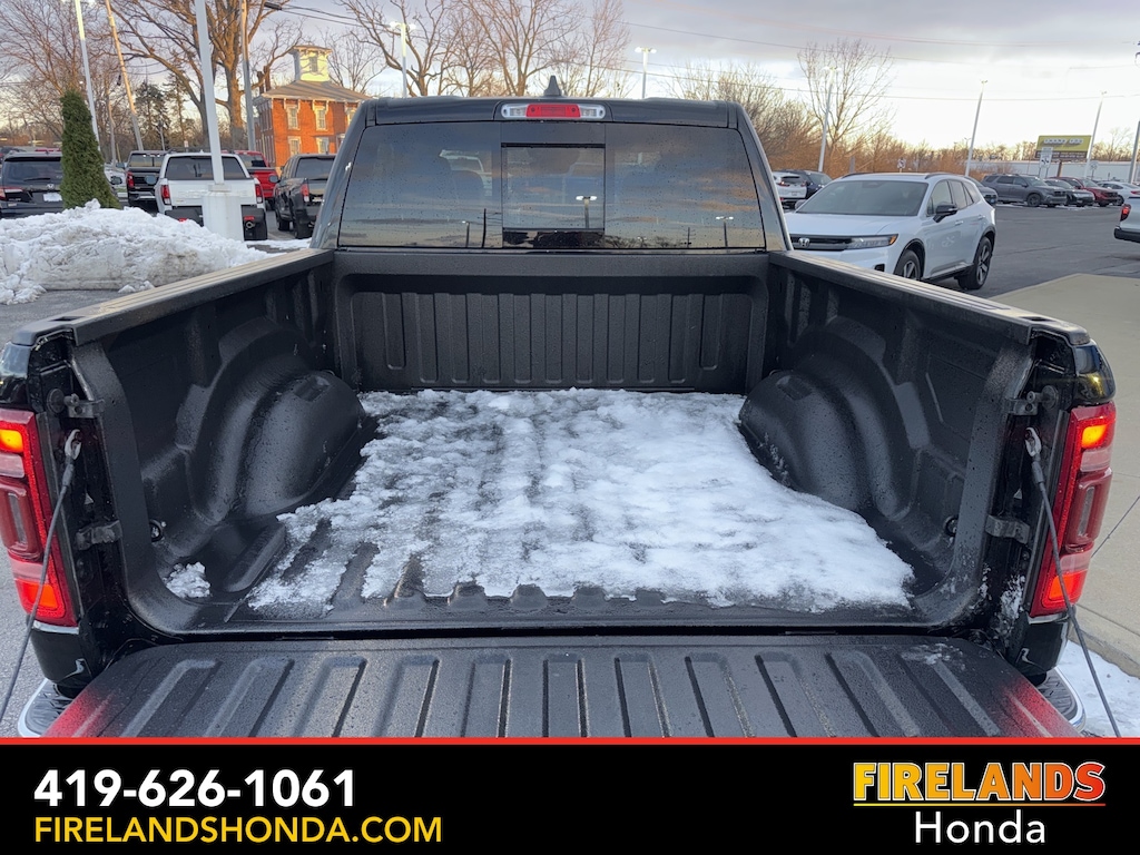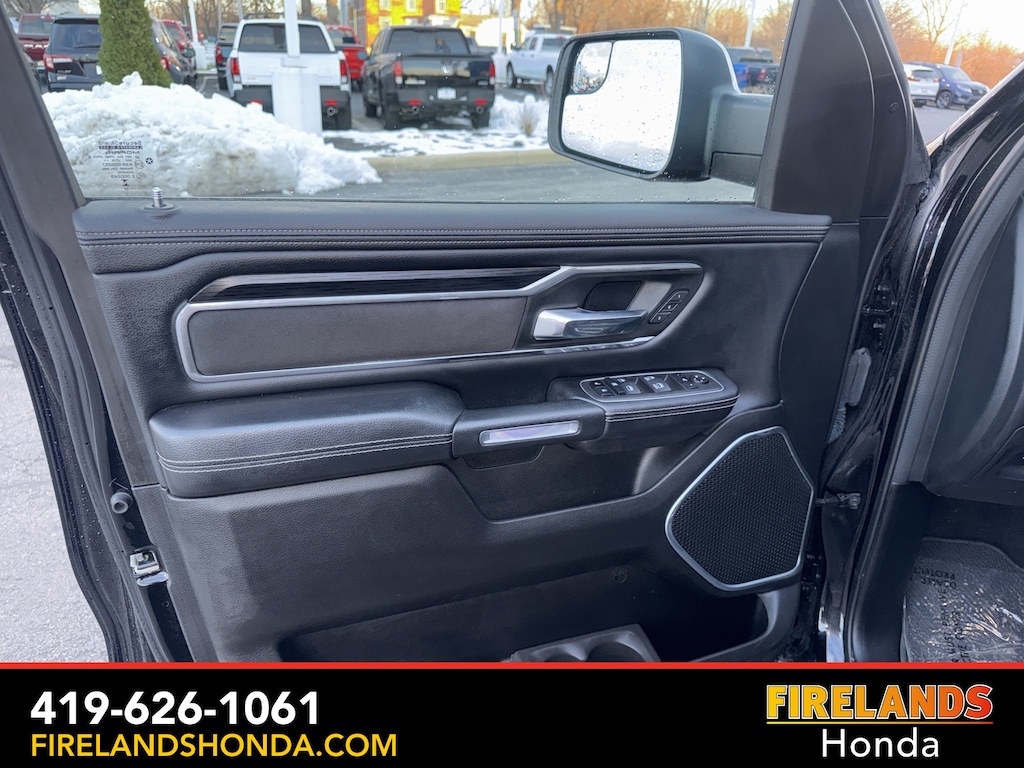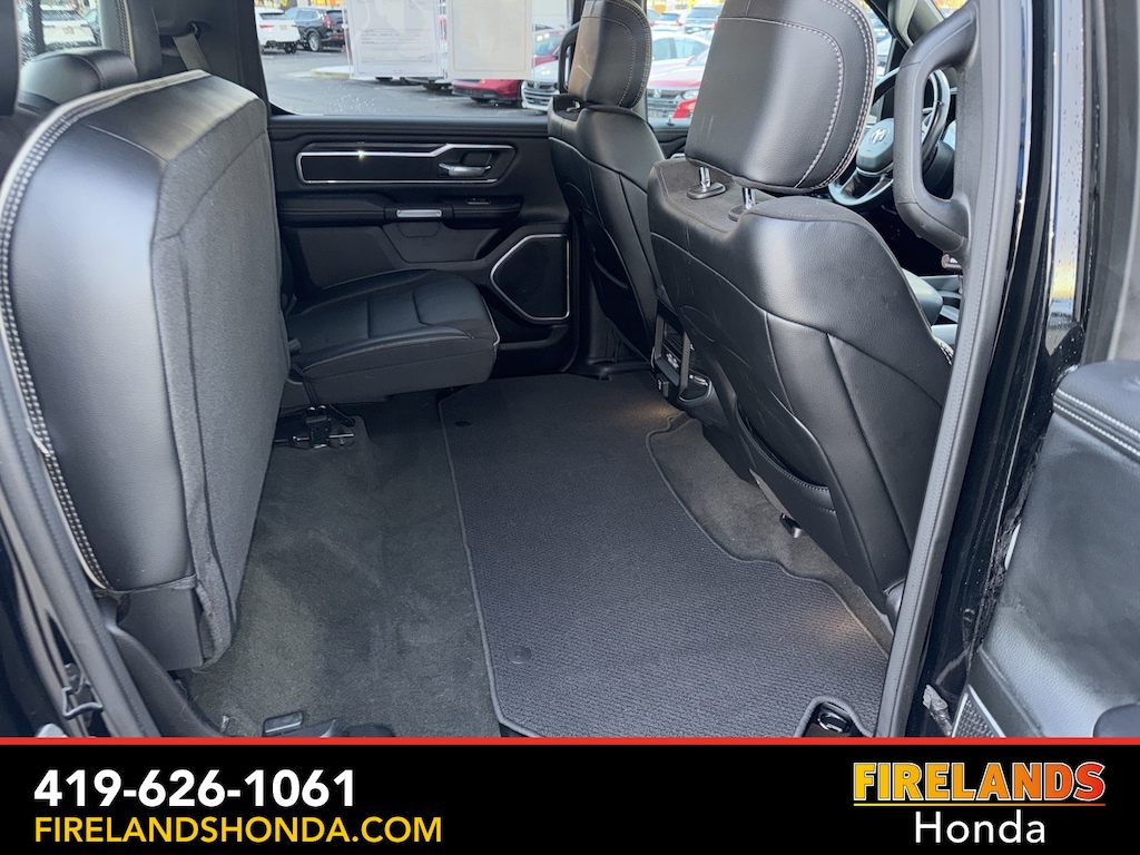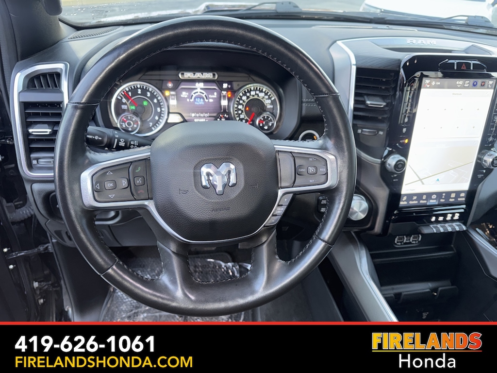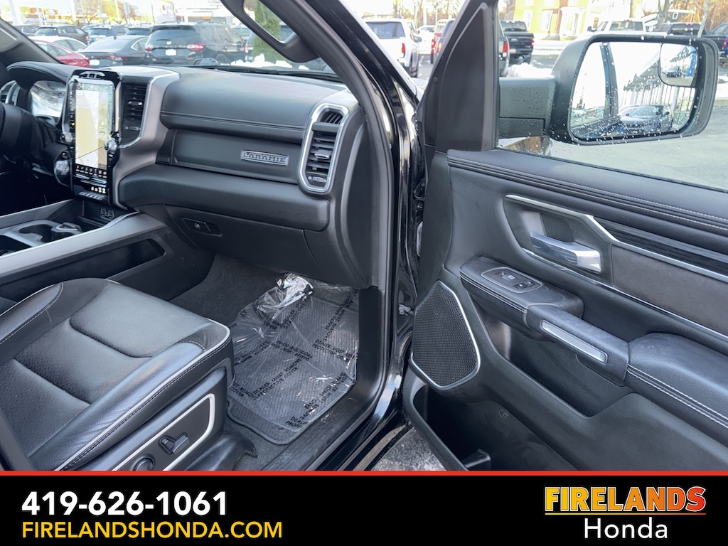 Firelands Honda is proud to offer this good-looking 2023 Ram 1500 in Diamond Black Crystal Pearlcoat. This 1500 has been checked by our award winning service department. Hot features include: Bluetooth Hands Free, Back Up Camera, Navigation / GPS, Remote Start, Local Trade, Ventilated/Cooled Seats, Balance of Factory Warranty, Service Records Available, 4x4, Heated Leather Seats, Locally Owned New Car Trade, Lane Departure Warning, Apple Carplay/Android Auto, Blind Spot Detection, Fog Lights, Automatic Emergency Braking, Forward Collision Warning, Rear Cross Traffic Alert, Clean CARFAX, One Owner, No Accidents, Trailer/Tow Package, Spray-In Bedliner, Power Folding Mirrors, Sliding Rear Window, 12" Touchscreen Display, 2nd Row In Floor Storage Bins, 4G LTE Wi-Fi Hot Spot, Apple CarPlay, Auto High Beam Headlamp Control, Blind Spot & Cross Path Detection, Connected Travel & Traffic Services, Connectivity - US/Canada, Disassociated Touchscreen Display, Electric Shift-On-Demand Transfer Case, Foam Bottle Insert (Door Trim Panel), For Details, Visit DriveUconnect.com, For More Info, Call 800-643-2112, Front Door Accent Lighting, Front LED Fog Lamps, Global Telematics Box Module (TBM), Google Android Auto, GPS Antenna Input, GPS Navigation, HD Radio, Integrated Center Stack Radio, Integrated Voice Command w/Bluetooth, Laramie Level 1 Equipment Group, LED Reflector Headlamps, ParkSense Front/Rear Park Assist w/Stop, Quick Order Package 27H Laramie, Radio: Uconnect 5 Nav w/12.0" Display, Rain Sensitive Windshield Wipers, Rear Door Accent Lighting, Rear Power Sliding Window, Rear Window Defroster, Remote Tailgate Release, SiriusXM Radio Service, SiriusXM w/360L, USB Host Flip.